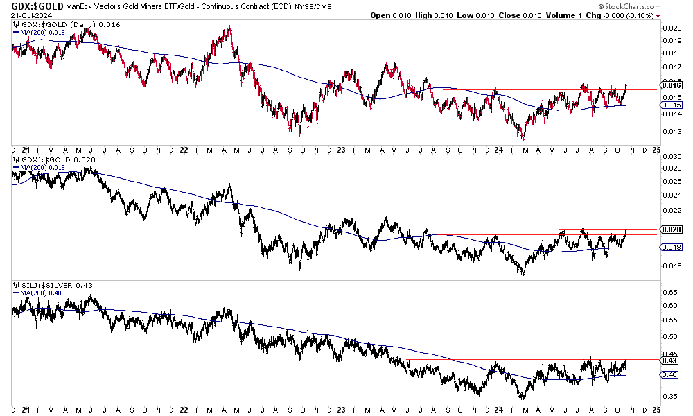 The gold stocks are very close to breaking out against Gold, and the same can be said about the silver stocks breaking out against Silver.