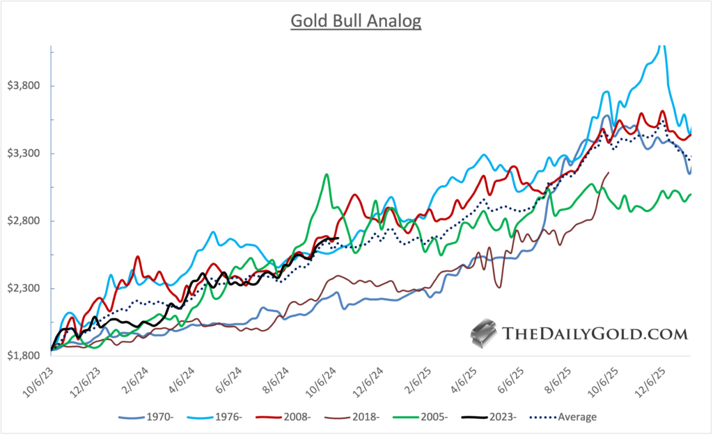 The Gold Bull Analog chart plots Gold against the four best cyclical bulls and an average (dotted line). The current bull in Gold is hugging the average.
