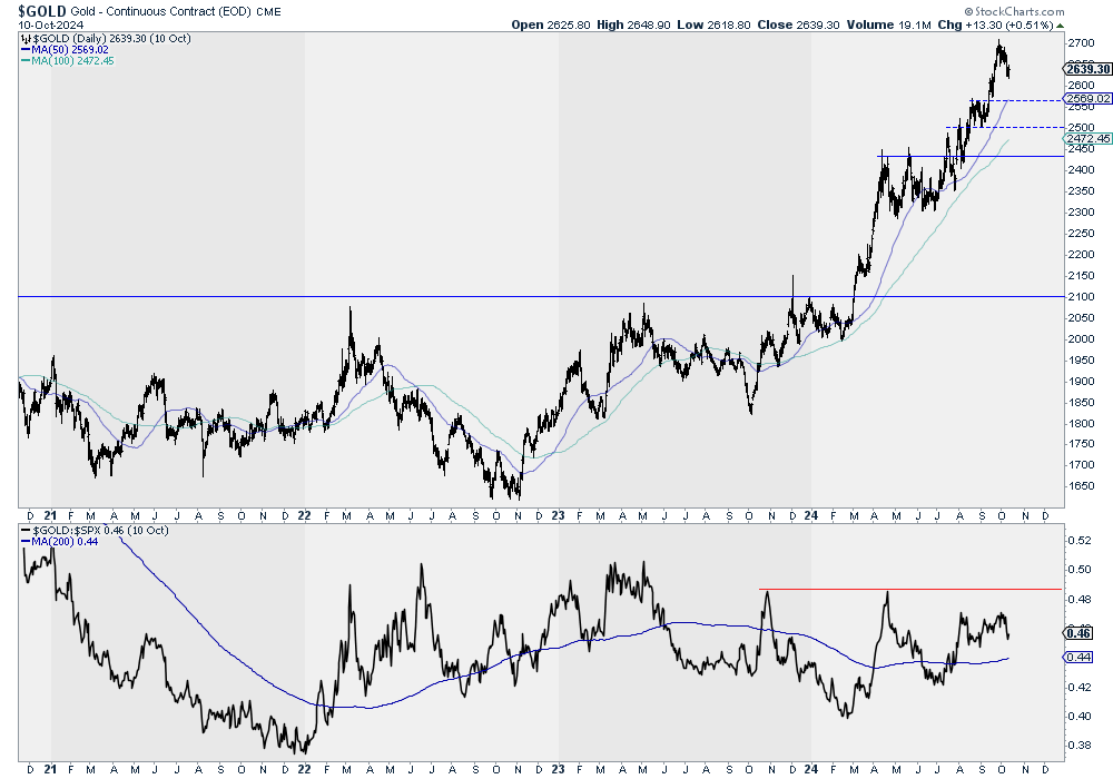 The more pressing issue is the negative divergence in the Gold to S&P 500 ratio which has made a lower high since Gold gained another 10%.