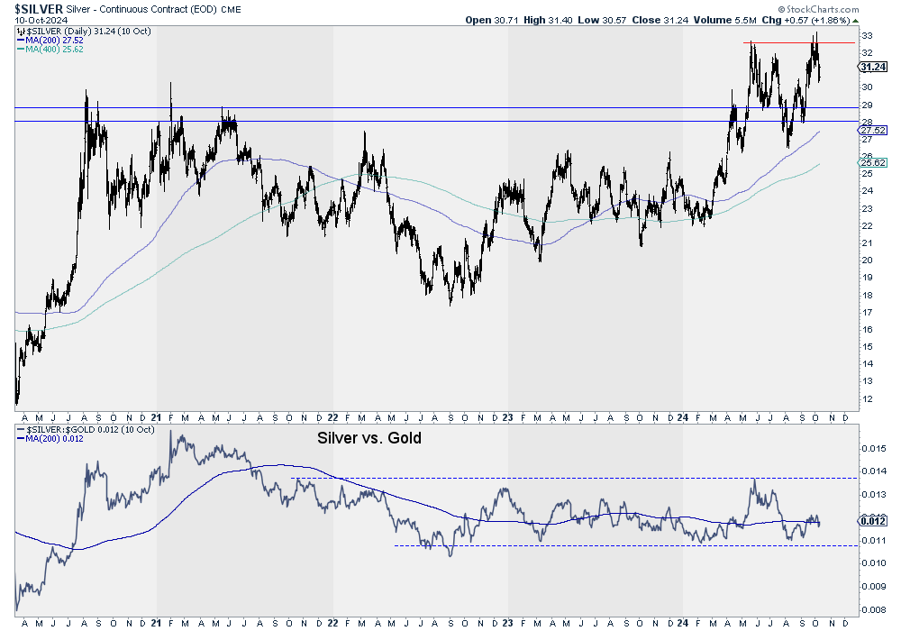 On the other hand, despite Gold’s move from $2000 to $2700, Silver has been unable to outperform Gold. The Gold/Silver ratio (inverted in the chart) peaked in the spring and remains range-bound.