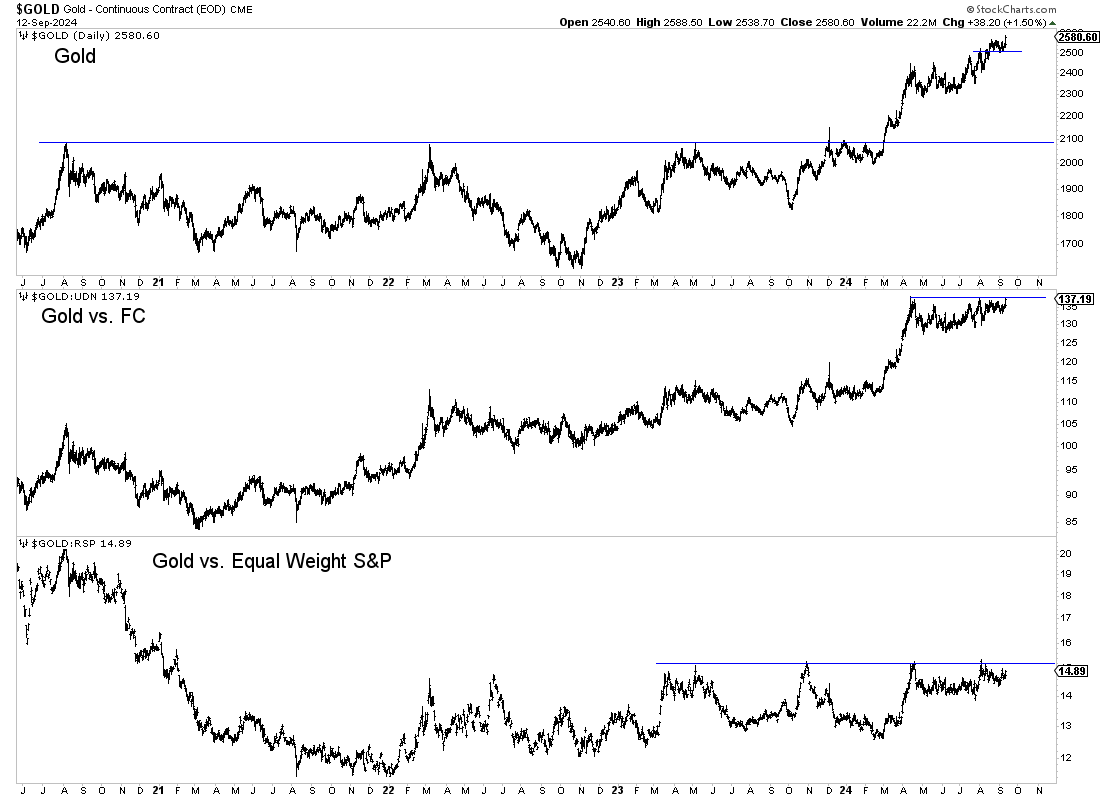 Gold against foreign currencies (Gold vs. FC) is breaking out from a five-month consolidation, and Gold against the equal-weighted S&P 500 is on the cusp of a new three-and-a-half-year high.
