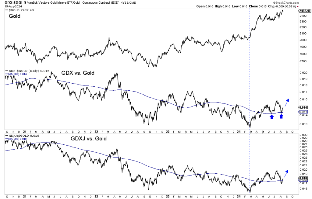 The GDX to Gold ratio again bounced at its 200-day moving average while the GDXJ to Gold ratio rebounded.