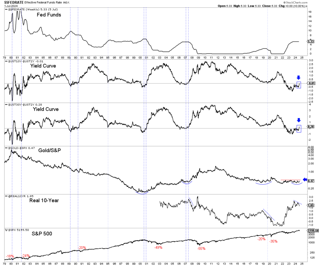 The last three times this occurred, it marked the start of Gold outperforming the stock market, Fed easing, and lower real interest rates.