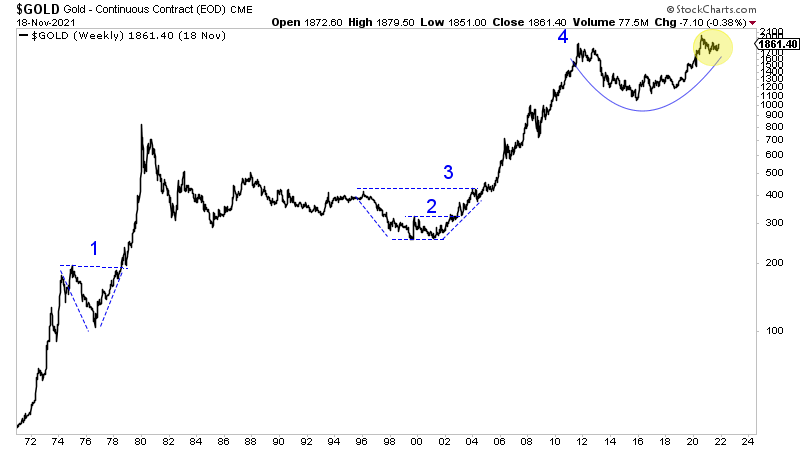 In the late 1970s, Gold exploded from a three-and-a-half year-long cup and handle pattern in which the handle was only four months long. Gold hit the log target only 15 months after the breakout.