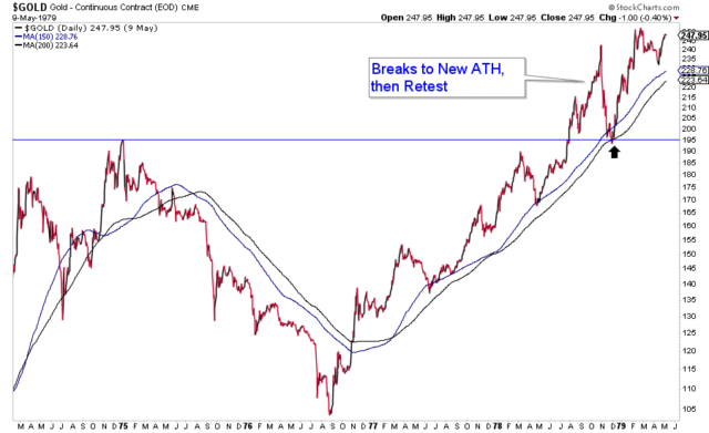 Gold gained a whopping 136% from its low in 1976 to its breakout in 1978. From the breakout to the first correction, it gained 25%.