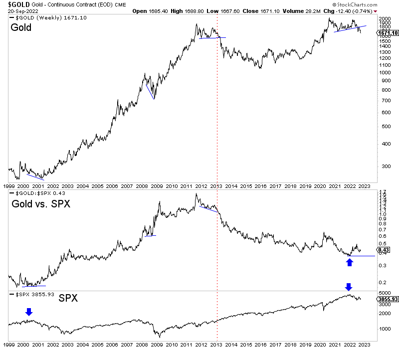 Furthermore, note that the bottom in the Gold to S&P 500 ratio in 2000 and presumed bottom at the tail end of 2021 coincided with major market peaks (blue arrows). Moreover, from mid-2012 through 2013, the S&P 500 did not even correct more than 9%!