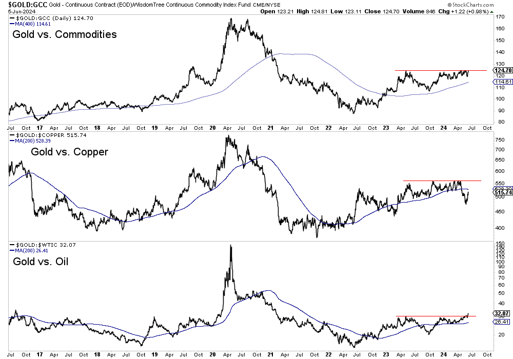 Gold has broken out to a 3-year high against Oil and is very close to making the same breakout against an equal-weighted basket of Commodities. If Gold continues to regain its outperformance against copper, it will be an economic warning.