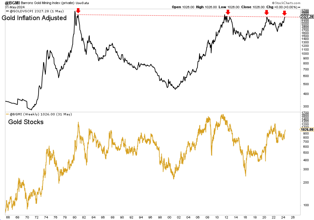 The Inflation-Adjusted Gold price closed May 2024 at a 12-year high and is fairly close to breaking out of a 45-year base. Note that the historical trajectory and shape of the Inflation-Adjusted Gold price is similar to that of the Barron’s Gold Mining Index.