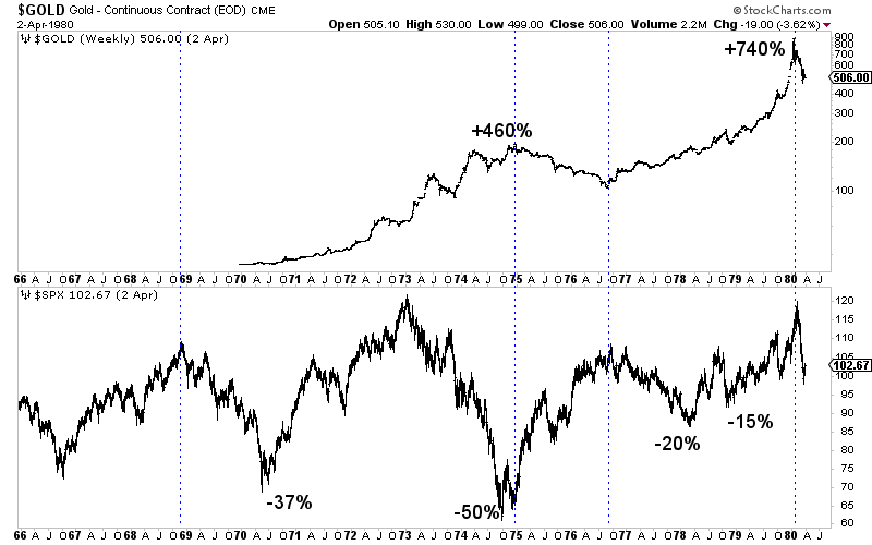 From 1969 through 1974 the S&P 500 had declines of 37% and 50%. During this period Gold gained 460%. (The gold stocks bottomed in 1969 five months before the stock market).