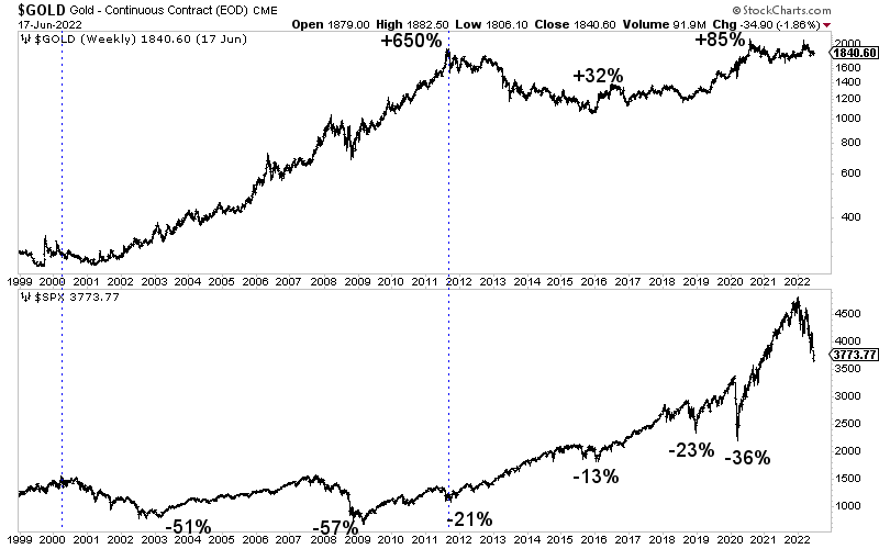 The 2000s were a similar story to the 1969 to 1974 period. The S&P 500 had twin declines of 51% and 57%, along with another decline of 21%. Gold gained 650%.