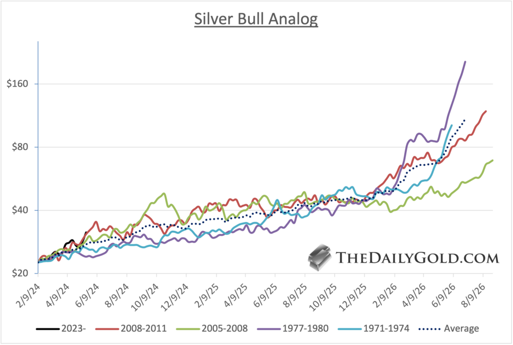 Interestingly, all four bulls and the average accelerate higher from around $50/oz in early 2026. The sooner Silver reaches $50/oz, the longer its correction and consolidation could be before it breaks $50/oz.