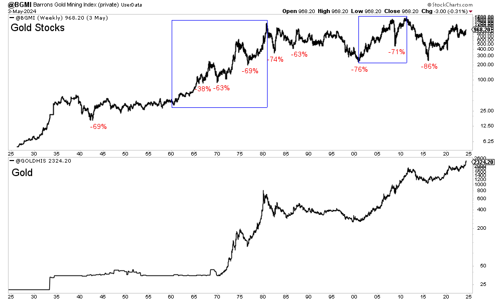 The Barron’s Gold Mining Index gained roughly 40-fold from 1960 to 1980 but endured declines of 63% and 69%.
