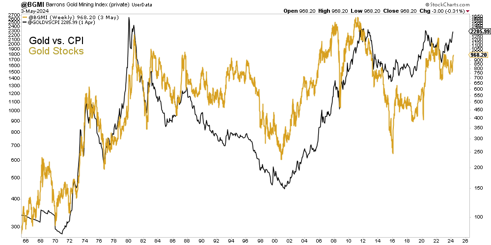 The chart below plots the Barron’s Gold Mining Index and the Inflation-Adjusted Gold price.