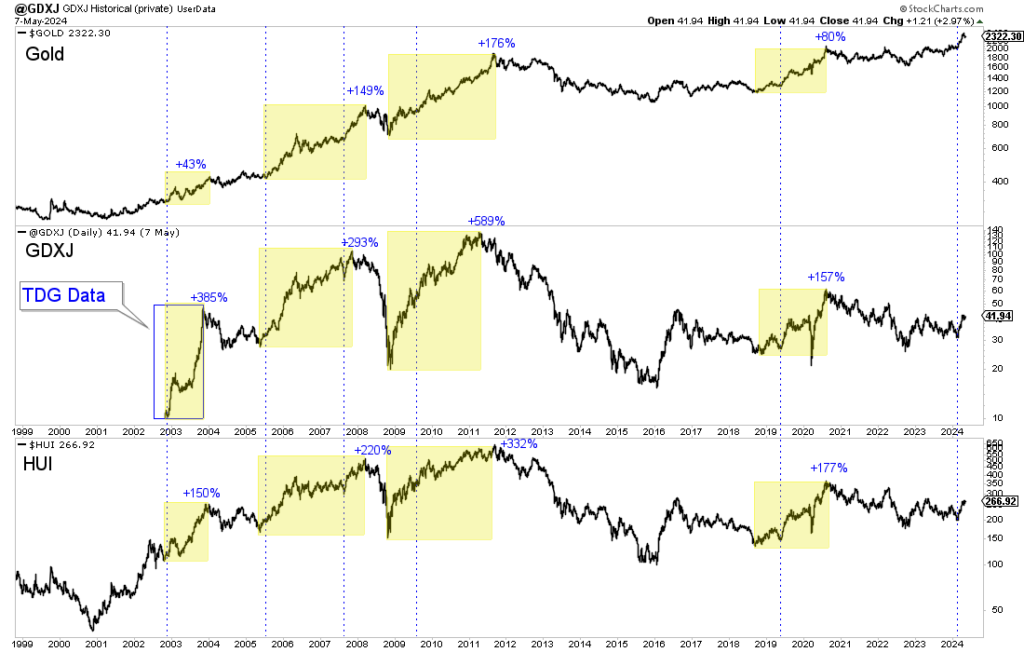 The chart below plots Gold, GDXJ, and the HUI. The yellow highlights cyclical bull markets, and the vertical lines mark Gold price breakouts.