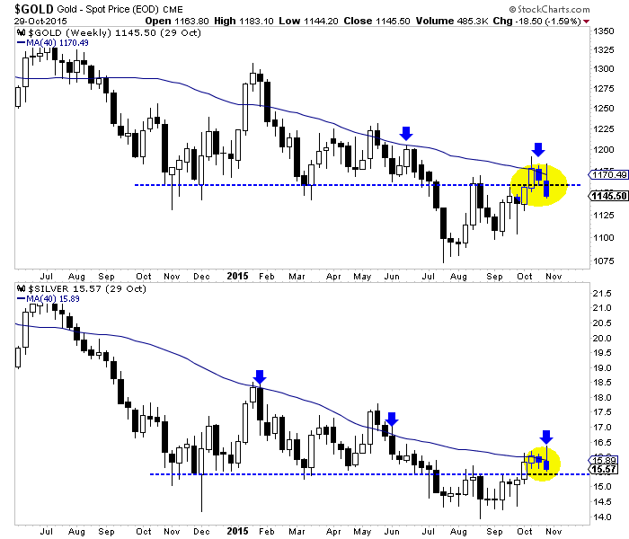 Below we show the weekly candle charts for Gold and Silver and their 40-week (200-day) moving averages. Gold tested moving average resistance in each of the past three weeks. The Fed decision induced a nasty reversal on the chart as Gold went from trading above resistance to well below it. Gold also lost the key weekly pivot point around $1150-$1160. Silver formed the same bearish reversal after testing moving average resistance during each of the past four weeks. (Another important point is Gold failed at $1180 on the monthly chart).