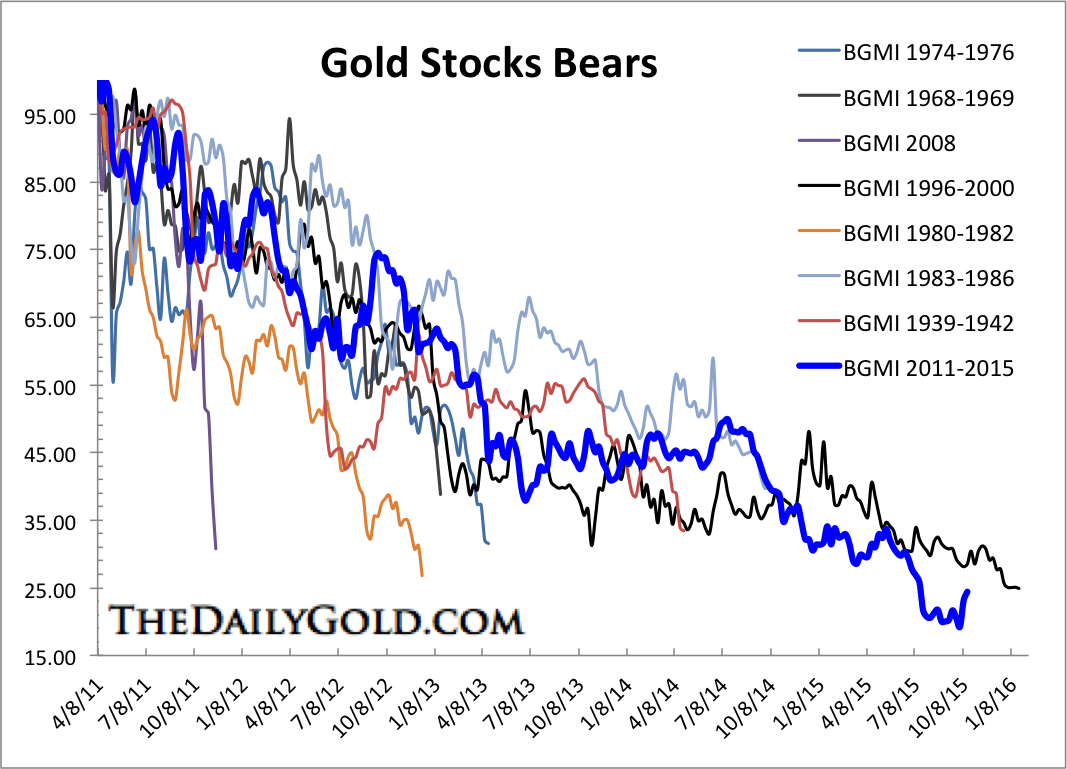 The gold stocks bear analog chart makes a strong case that the mining sector may have reached its low. The current bear market is nearly as long as the 1996 to 2000 bear and in terms of just about every index (BGMI, XAU, GDM) is worse in price. One should also keep in mind that the miners bottomed five months before Gold at the end of that bear.