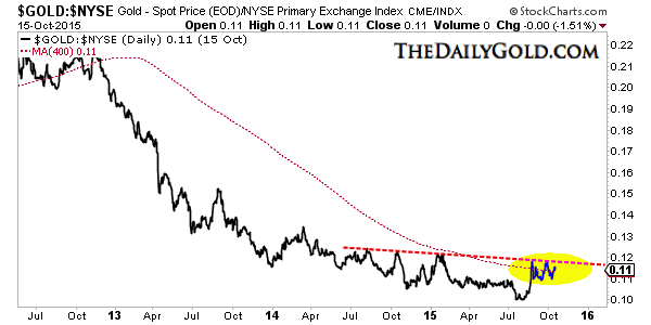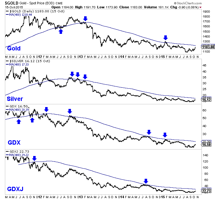 While the 200-day moving average (dma) is important, it is not as significant as the 400-dma moving average which does a better job of defining bull and bear markets. Take a look at the chart below and note how the 400-dma has capped the best bear rallies of the past three years. As bulls, we need to see precious metals rally past the 200-dma and reach the 400-dma. Breaking above the 400-dma would confirm a new bull market has begun but merely reaching the 400-dma would be a strong first step.