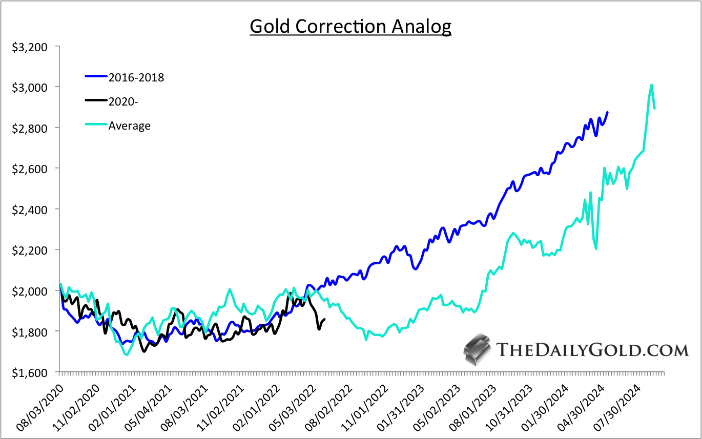 Gold was tracking the average of all bull market corrections and the ensuing rebounds until the recent decline below $1900.