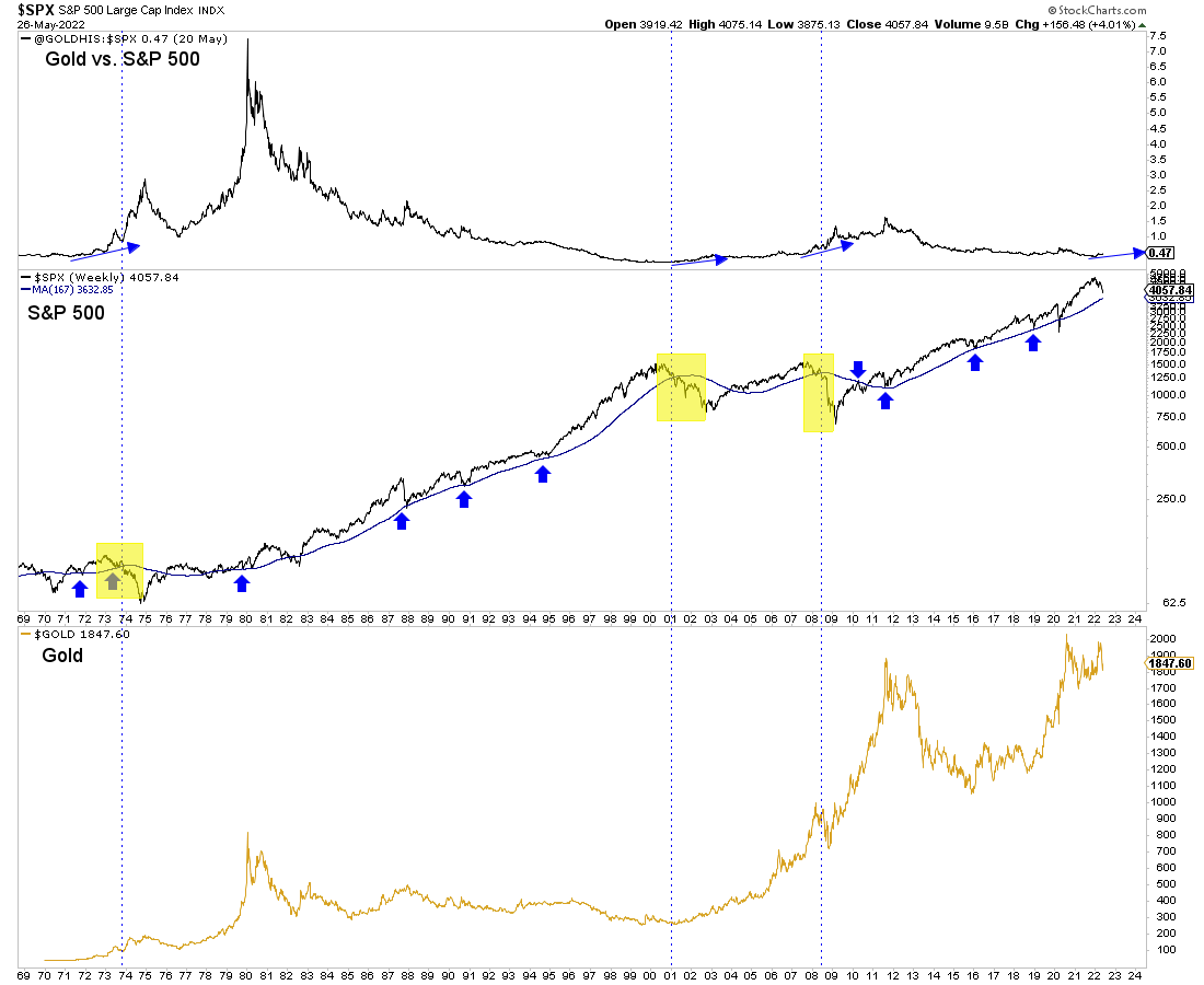 Should the S&P 500 lose its 40-month moving average later this year, then, it would be in its worst bear market in 14 years, and the Fed would likely be talking about easing. Gold would be in a position to break out.