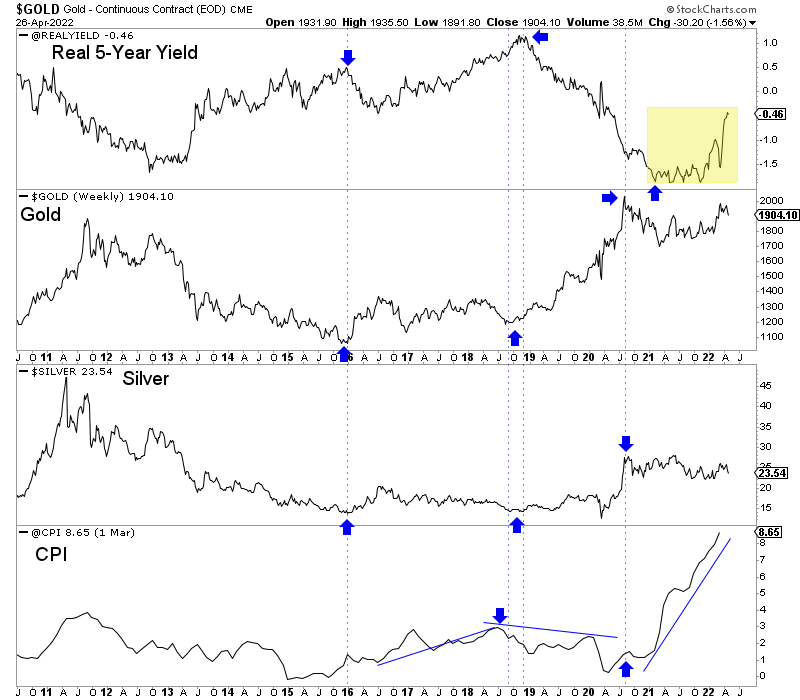 Since 2016 Gold and Silver have underperformed during rising inflation due mostly to rising real interest rates.