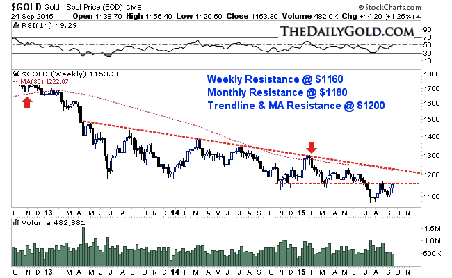 Gold’s budding strength against global equities is very positive but it does not necessarily signal a Gold bottom in nominal terms. If Gold has already bottomed then it has quite a bit of work to do to confirm the low. Ultimately, Gold would exceed the January 2015 high at $1300 but there is plenty of other resistance along the way. First, lets see if Gold can close the week above $1160. Second, it has to close above $1180 on a monthly basis. Then it would need to surpass a confluence of resistance at $1200.