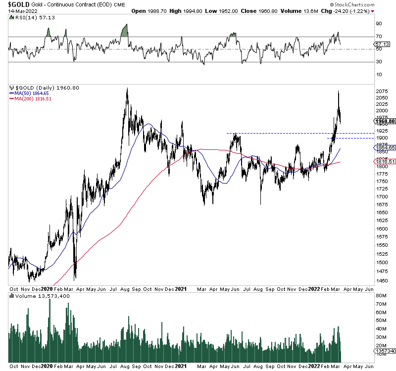 Gold has strong support at $1920 and $1900 and the top of the breakaway gap at $1908. A test of $1908 would mark an 8% decline from the peak.
