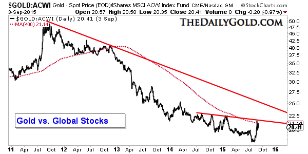 However, the one positive, as we noted last week is Gold is firming in real terms. Specifically Gold is gaining some strength against global equity markets. Gold relative to emerging markets has already broken out but next it must break the downtrend against global equities. Below we plot Gold against the all country index ETF. The ratio closed at a 6-month high a few weeks ago and is very close to retesting a confluence of resistance.