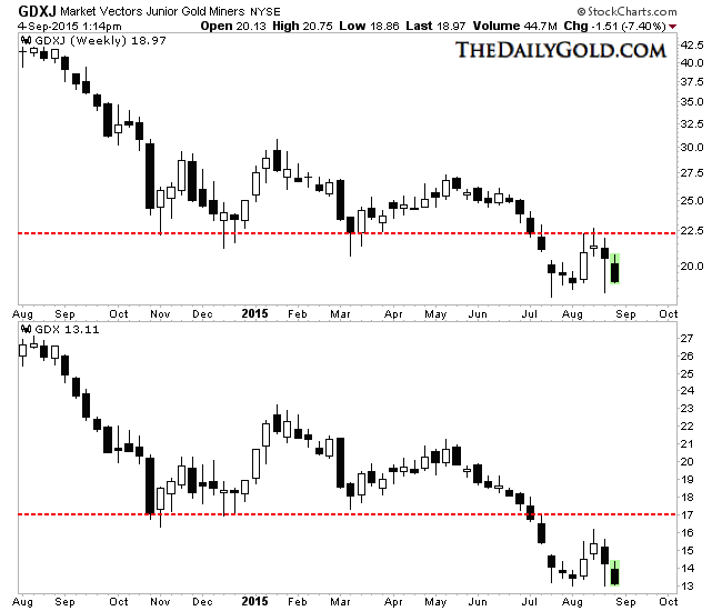 As the last week of summer (unofficially) comes to a close, the near term prognosis in the miners could not be more clear. The weekly candle chart for GDXJ and GDX is below. Both are set to close the week near or at the summer lows. Note the difference between the past few months and last winter. As the miners carved out a bottom last winter they formed strong white candles during up weeks. They held their gains and closed near the highs. That established support which held for seven months. Recent action is a strong contrast. The reversal candles in July were only mild in strength. In addition, although the miners gained in August, they failed to close near the highs of the week. That is a sign of distribution. Also, the reversal last week was temporary as miners are going to close this week near their lows. Finally, note how GDX was so weak that its rebound failed to touch $17.