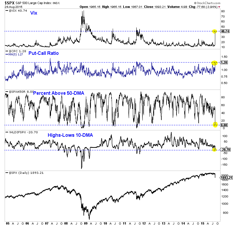 The Vix hit a 4-year high while the put-call ratio hit a 3-year high. Only 8% of stocks are above their 50-dma. That is the lowest in 4 years. The difference between new highs and new lows is at a 4-year low.