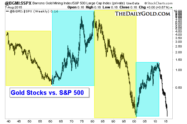 Featured Gold Stocks vs. S&P 500 By Jordan Roy-Byrne CMT, MFTA •Posted on August 09, 2015 Gold miners are the cheapest ever relative to Gold and now are inches away from being the cheapest ever relative to the S&P 500. Note how similar the past four years are to the period of 1996-2000. Barrons Gold Mining Index vs. S&P 500