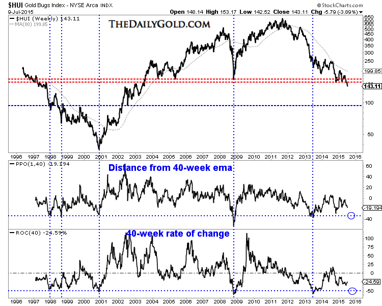 In the chart below we plot the HUI’s weekly price going back 20 years and two oscillators which can serve as overbought and oversold indicators. We plot the HUI’s distance from its 40-week exponential moving average and its rolling 40-week rate of change. The HUI is certainly oversold but these two oscillators argue the HUI is some distance from reaching the extreme oversold condition seen in spring 2013, late 2008 and late 2000.