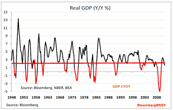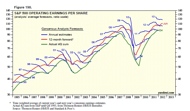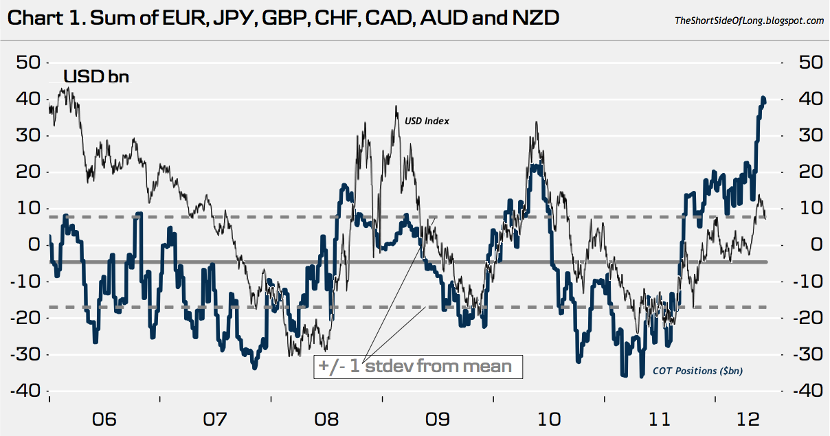 - Fundamental Outlook: I believe that we approaching another bear market as the recovery loses steam. I am not sure if politicians can hold it off until elections in both US and Germany pass, but 2013 and 2014 will most likely be bad years. US GDP has grown 5 quarters at around 2% or lower which is stall speed. Over the last 60 years, whenever the economy grows at subpar levels it has always entered a recession. At the same time earnings and margins are at record highs, so I expect that they will mean revert. During recessions since the 1950s, earnings tend to fall on average by 25%, so a drop to $70 from current levels in earnings could take the S&P 500 down below 1,000 points (P/E = 12 * $70). Cash levels in money market funds are as low as 1998/99 and 2006/07, so I believe investors are extremely exposed to risk assets. Corporate credit spreads are very narrow relative to economic fundamentals, so I expect they will widen dramatically in due time. Recessions occur every 3 to 4 years of expansion during secular bear markets, so in 2013 or 2014 we are overdue for a slowdown (but it could be much earlier).