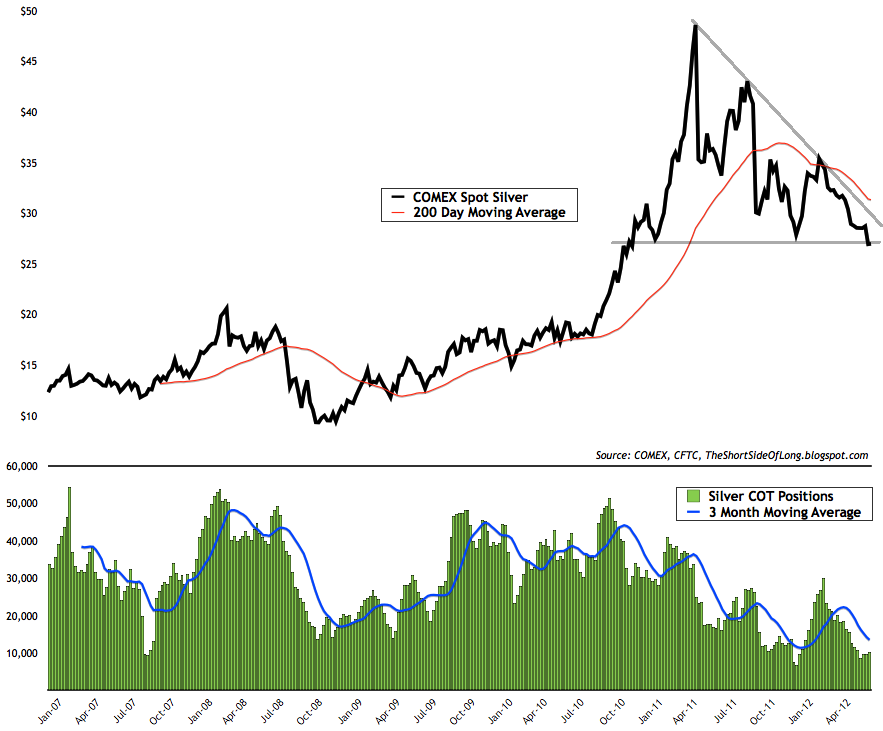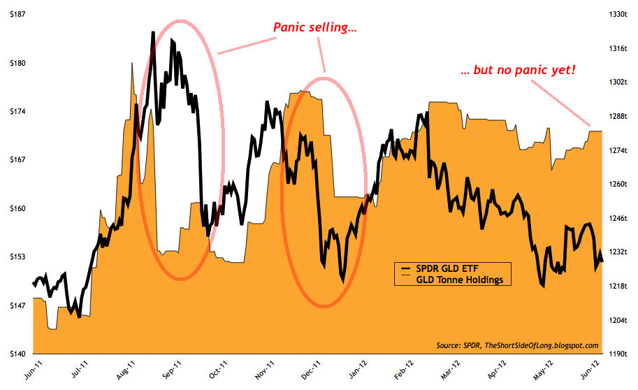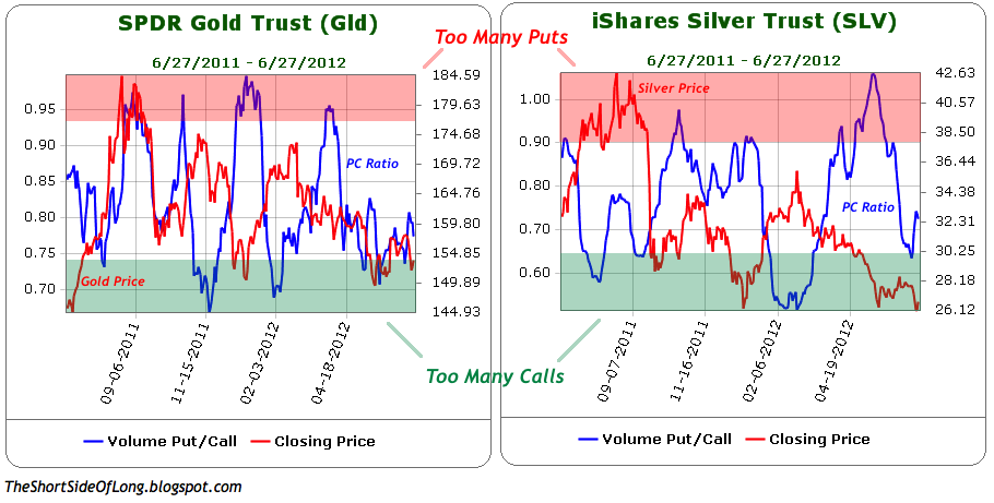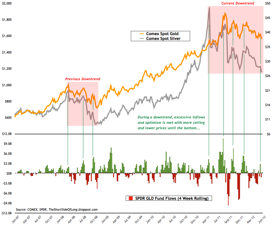 Price wise, Gold and Silver remain in a downtrend, which is a series of lower lows and lower highs on a closing basis. This can be seen in the chart above. During a downtrend, excessive inflows into GLD ETF seem to be a strong contrarian signal of optimism which tends to be met with more selling. While we are witnessing slight outflows this week, we do not have panic similar to that of late September or late December 2011 just yet.