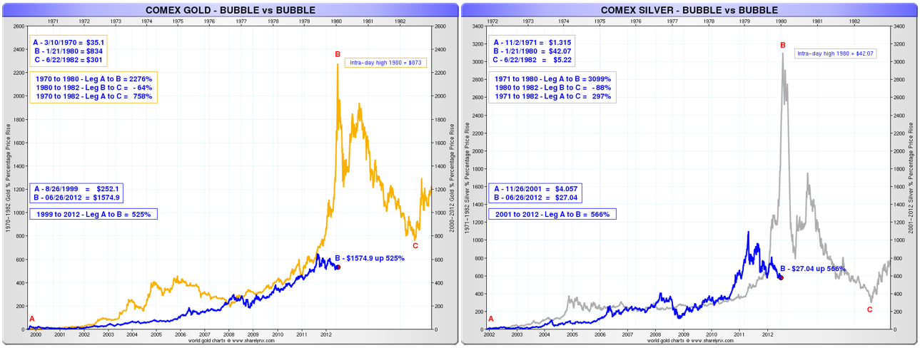 We are currently still in a cyclical bear market correction during a longer term PMs secular bull market. Comparing the current price action to that of the 1970s price action, we can see that Gold and Silver are definitely not in a bubble or overvalued in a huge speculative mania. Gold would have to reach levels higher than $7000 and Silver higher than $150 to match the 1970s secular bull market gains.