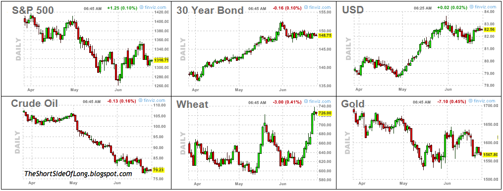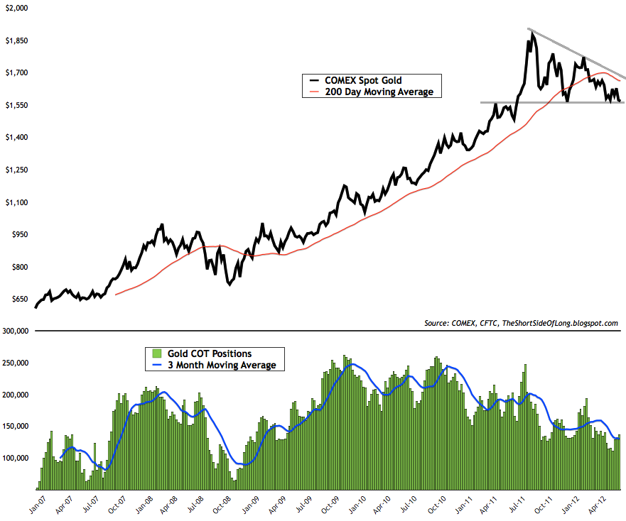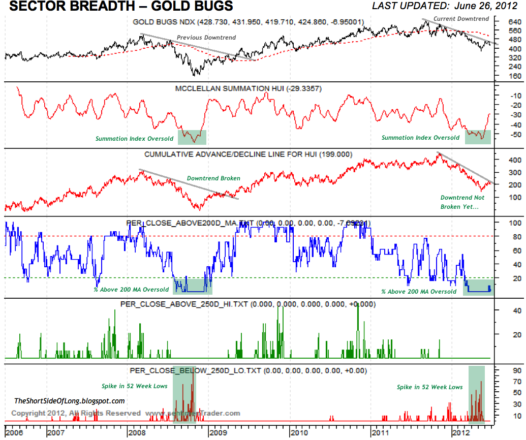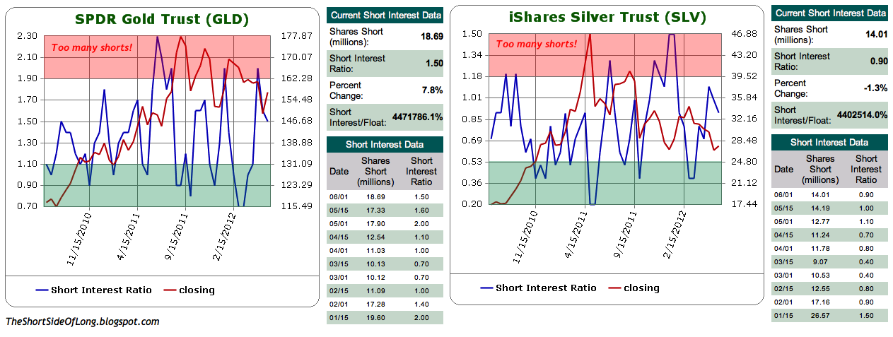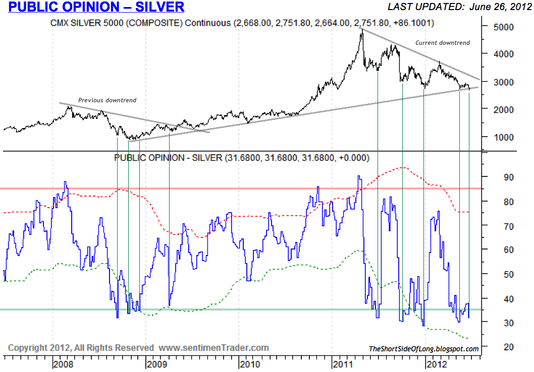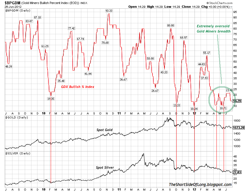 Short Interest ETF positioning in the Precious Metals sector is not at very extreme levels to indicate a contrarian buy signal just yet. Having said that, the data is lagged and only valid until 01st of June 2012, so there is a possibility that more short interest was engaged since than. During a late December 2011 bottom in Gold @ $1,530 short position reached 22 million shares, while Silver @ $26 short position reached 26.5 million shares. Today, we have 18.7 million shares sold short on GLD and only 14 million sold short on SLV. Defiantly not as bearish and therefore not as strong of a contrarian signal as last time we traded around these levels.