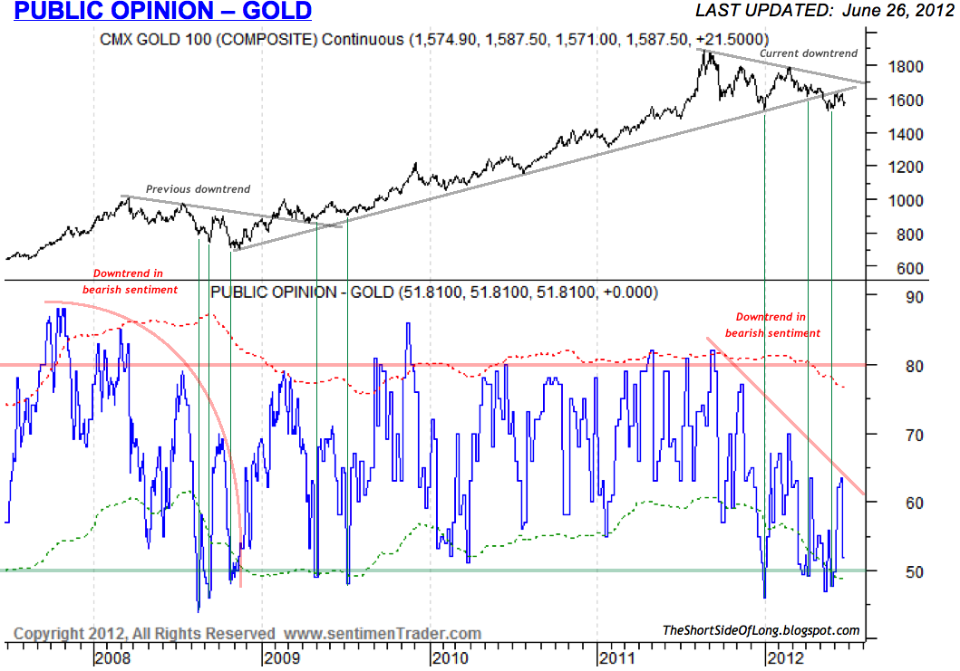 Public Opinion on Gold, which is a select group of sentiment surveys, fell quite hard once again this week. Having said that, a strong contrarian buy signal from bearish extreme levels usually occurs as readings drop below 50% bulls and we aren’t quite there just yet. Another major point I would like to put forward is that Gold’s bearish sentiment has been trending downwards since August 2011, similar to the way it was trending downwards in 2008. Eventually, we will have no bears left and from those negative extremes a new cyclical bull market will be born.