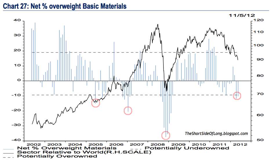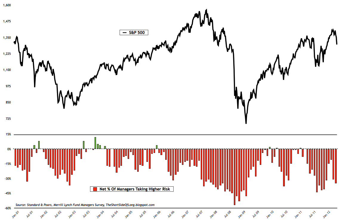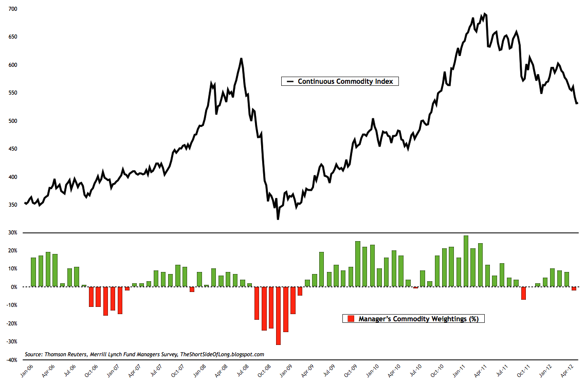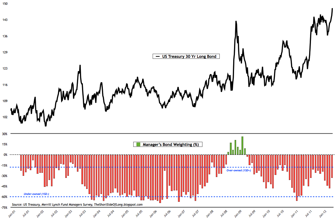 Merrill Lynch survey also showed that cash is not the only popular safe haven investment right now. Bond allocations also rose in May, as risk appetite waned. A net 33% of fund managers are now underweight bonds, which is down from a net 48% of fund managers only a month ago. Despite a powerful rally in the Bond market, majority of fund managers still seem to be only modestly exposed to this asset class, even with ongoing Eurozone worries.