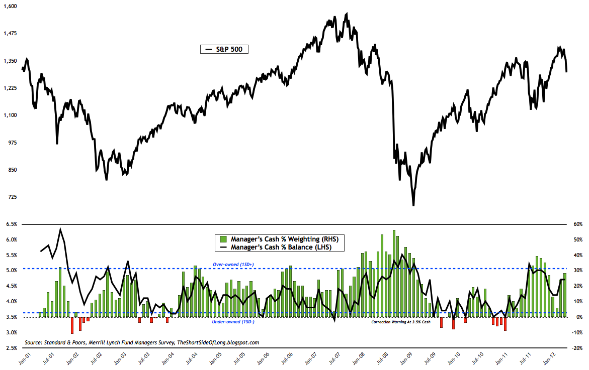 While the chart doesn’t show exposure to global equities, the survey went onto show that is has modestly been reduced. Merrill Lynch stated that “equity allocations declined to a net 16% overweight from 26% overweight last month as investors took risk off the table. The current allocation to equities falls roughly in the middle of the range relative to history.” So in other words, equity managers are not yet in panic mode, but do keep in mind that the survey was done between 4th and 10th of May, which means as selling intensified, managers could have cut their weightings further.
