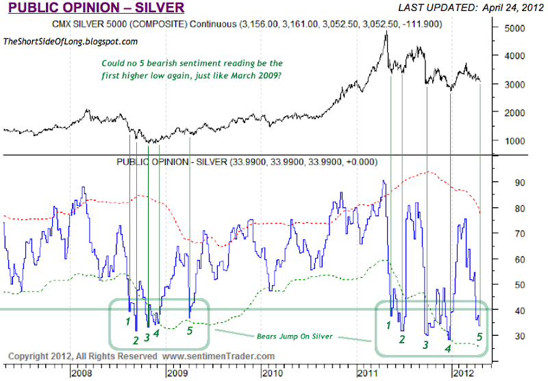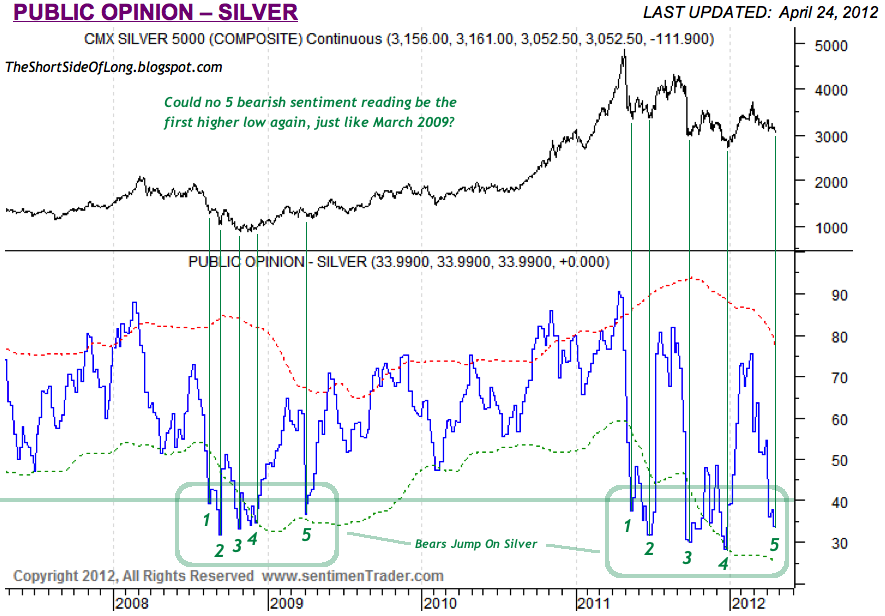 I have numbered the similarities in the 2008 cyclical bear market with the current cyclical bear market decline with 5 main contrarian signals. All signals dipped below 40% bulls and incase you are wondering what the range of the indicator is – we have moved from 90% bulls to 29% bulls over the last decade. In 2008, the 5th contrarian signal was the final low and the first higher low for the Silver price. Could we now repeat the similar outcome here in May 2012? A refusal to make a new low by Silver, while the Fed currently refuses to engage into QE3 would be a major bullish sign and a potential start of a new cyclical bull market similar to point No. 5 in March 2009.