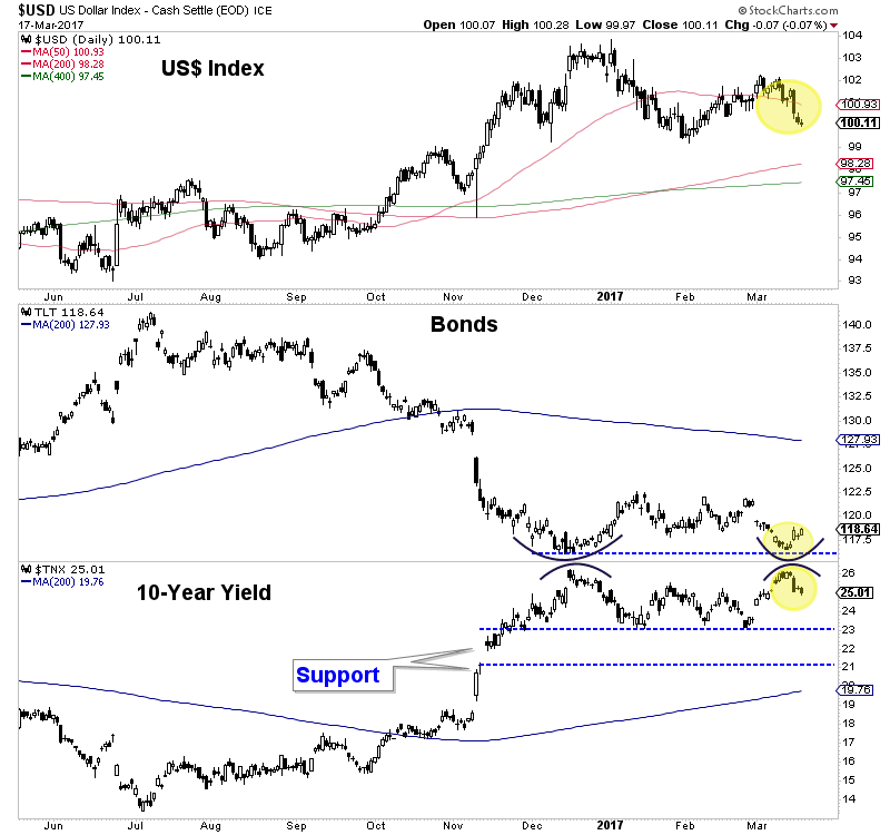 Precious metals should trend higher in the short-term if the current macro technical landscape does not change. The US Dollar index has fallen below its 50-day moving average and could fall another 2% to moving average support. Also, despite the Fed rate hike, the 10-year yield did not make a new high. Bonds could rebound and the huge speculative short position, if unwound could add to the rebound. A rally in Bonds coupled with a weak US Dollar would help precious metals.