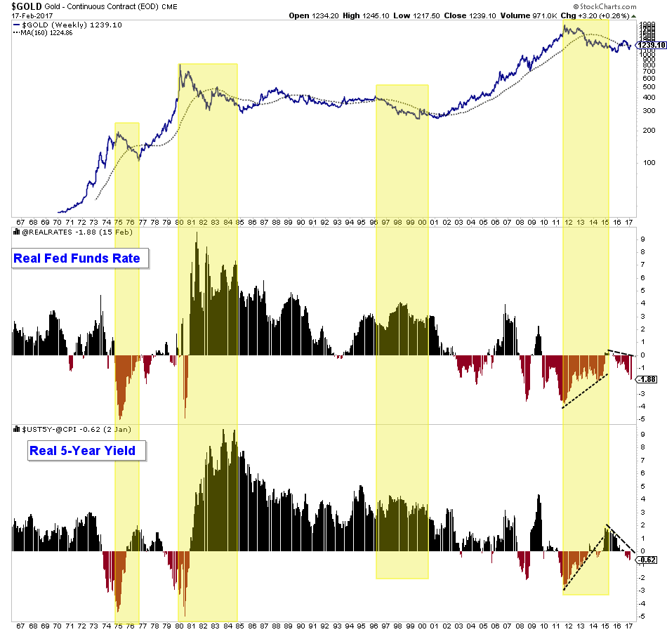 The January headline consumer price index (CPI) came in at 2.5%, which is near a 5-year high. What happened to deflation? As a result, real interest rates declined deeper into negative territory or in the case of the 10-year yield, went from positive to negative. No this isn’t a commodity-driven story. The core CPI (ex food and energy) has been above 2% since the end of 2015 when commodities were in the dumps. Inflation is perking up and couple that with a Fed that pursues rate hikes at a glacial speed and that is very bullish for precious metals.