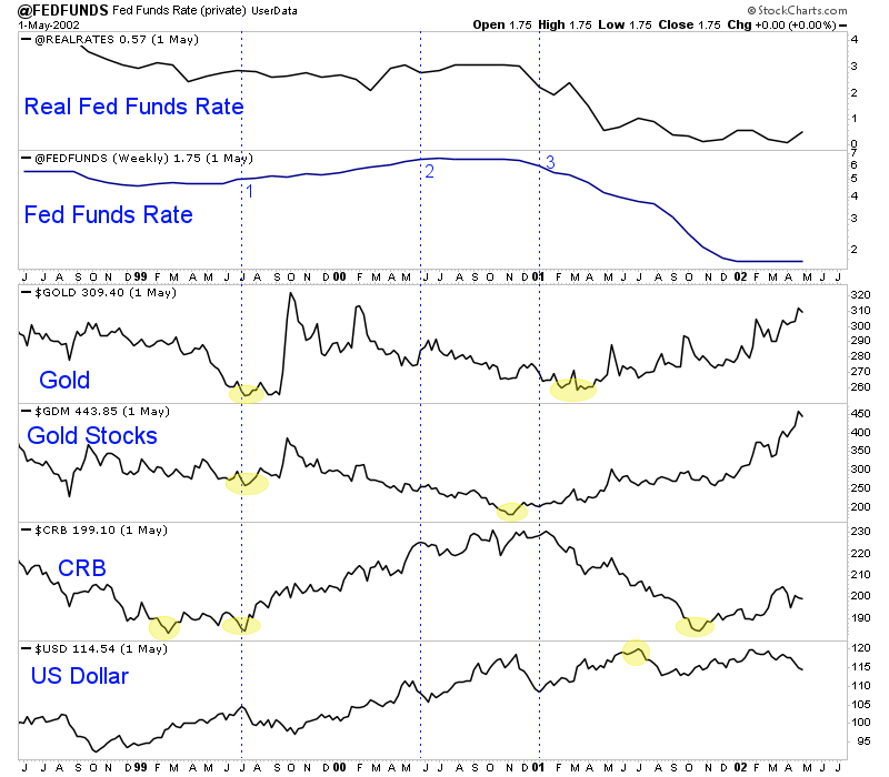 Gold and gold stocks began their bull market around the time of the Fed’s next rate cut which is also when real interest rates began to decline considerably.
