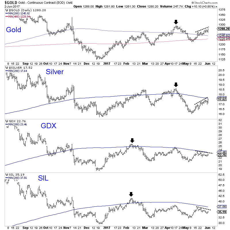 Given the weakness in the US Dollar and strength in Gold, one would think the gold stocks would be trading materially higher. In our view, the relative weakness in the sector is not an opportunity but a warning that Gold could reverse soon. We’ve seen this movie before and it usually plays out negatively for the bulls. Unless taking advantage of “fishing line” type of declines in individual GDXJ stocks we think it’s prudent to wait for a lower risk opportunity. We continue to wait patiently as we expect lower prices and a good buying opportunity in select juniors at somepoint this summer. For professional guidance in investing in this sector consider learning more about our premium service including our current favorite junior exploration companies.