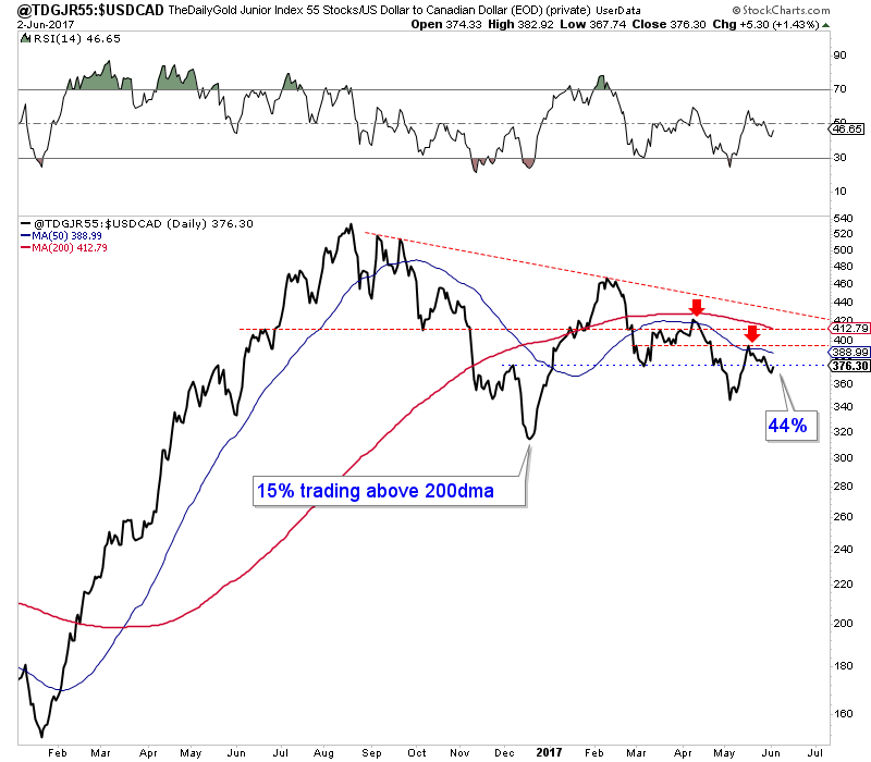 The miners and even the juniors are not so oversold at the moment and would be susceptible to losses should Gold form a bearish reversal soon. Here are a few factors to consider. The bullish percentage index (a breadth indicator) for GDX remains at 39%. I would deem anything below 20% as very oversold. Meanwhile, from our 55-stock junior index charted below, 35% of the stocks are trading above their 50-day moving average while 44% are trading above their 200-day moving average. That is a bit high considering the bearish technicals of the index, which remains below falling moving averages and has room to fall before reaching strong support.