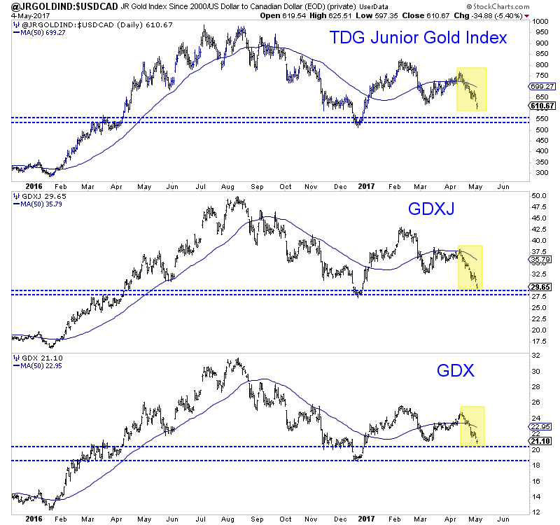 We plot the daily bar charts of our in-house junior gold index and GDXJ below along with GDX. The junior sector has been hit especially hard partly due to news that GDXJ, because of massive inflows will be cutting its stake in various juniors and investing in larger companies. Regardless of the why, the charts are the charts and much damage has been done. However, both junior indices have a bit more downside potential before testing strong support. GDX has good support roughly 4% below Thursday’s close.
