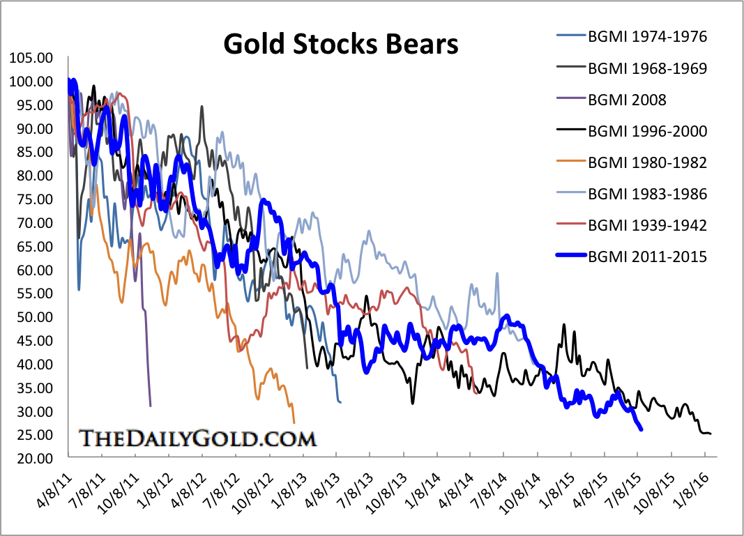 On a cyclical basis, gold mining stocks are arguably the most oversold ever. GDM and XAU have already surpassed their 1996-2000 bear markets. The next data point in the Barron’s Gold Mining Index (whose bear market analog is shown below) will show the current bear surpassing that of 1996-2000. The HUI needs to close at 100 to equal its 1996-2000 bear. Any low in the gold miners weather it occurs in the coming days or next few months has a chance to mark the end of the bear market.