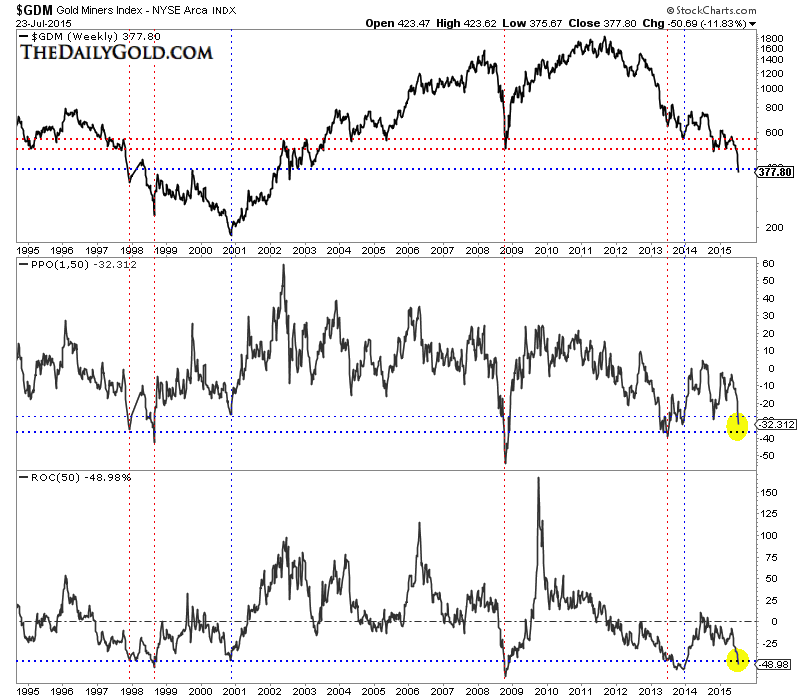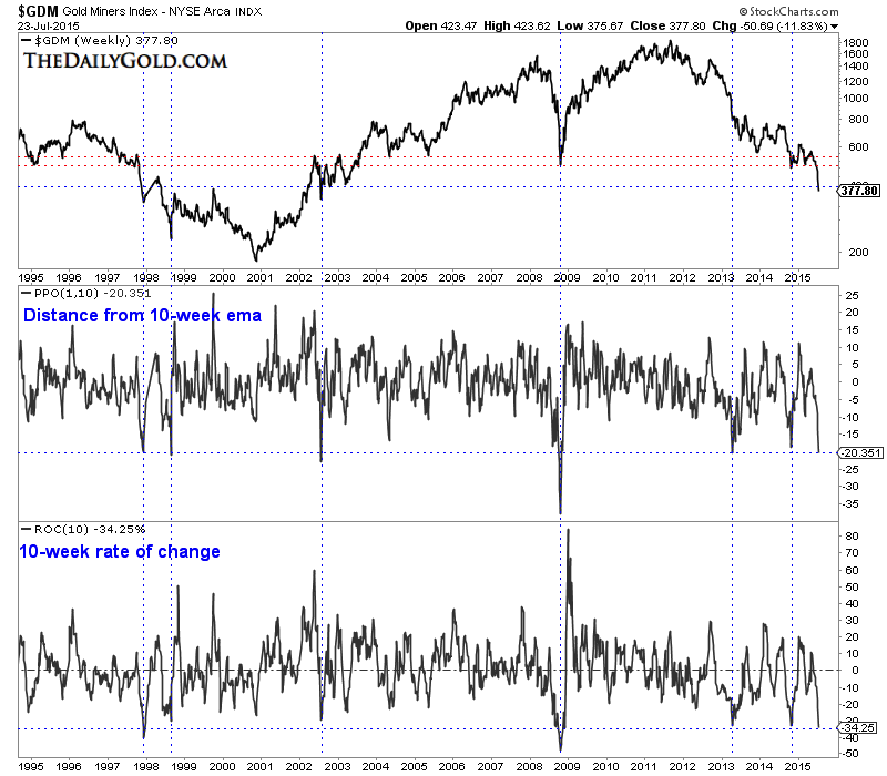 Though GDM (GDX) has closed below support at 400, it has done so in an extremely oversold state. In the first chart we plot GDM with its distance from its 50-week exponential moving average and its 50-week rate of change. If we count the two oversold instances in both 1998 and 2013 as only one then GDM is at one of its five most oversold points in the past 20 years. With a down day on Friday GDM would be at its third most oversold point in the past 17 years.