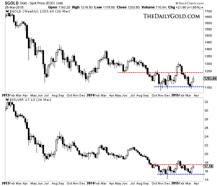 Below is a weekly candle chart of Gold and Silver. Support for Gold is now well defined around $1150. There is major resistance at $1220-$1240 as well as $1300. Meanwhile, Silver has support around $15.50 with resistance at $17.50 to $18.50. If the metals can takeout their January highs then they would definitely be in a new bull market. Conversely, if metals takeout their March lows to the downside, then it could mark the final breakdown of the bear market.