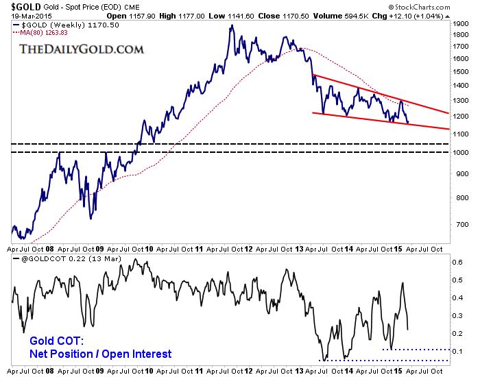 Precious metals are closing the week out with a good rally. The Federal Reserve nonsense proved to be a catalyst as it can be in either direction. Regardless of the Fed, the precious metals sector was oversold and due for a bounce. We wrote about that last week. Maybe this could be the bear market bottom. Maybe not. It concerns us that Gold is rebounding from an area of insignificant long term support amid sentiment that is not at a bearish extreme. Extreme bearish sentiment coupled with very strong support raises the probability of a major rebound or bear market bottom. I don’t see that for Gold, yet.