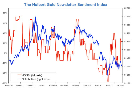 Mark Hulbert’s HGNSI is not looking to favorable for contrarian bulls. The HGNSI was over -50% at Gold’s summer bottom. With Gold trading around $1300 the indicator is above 20%.